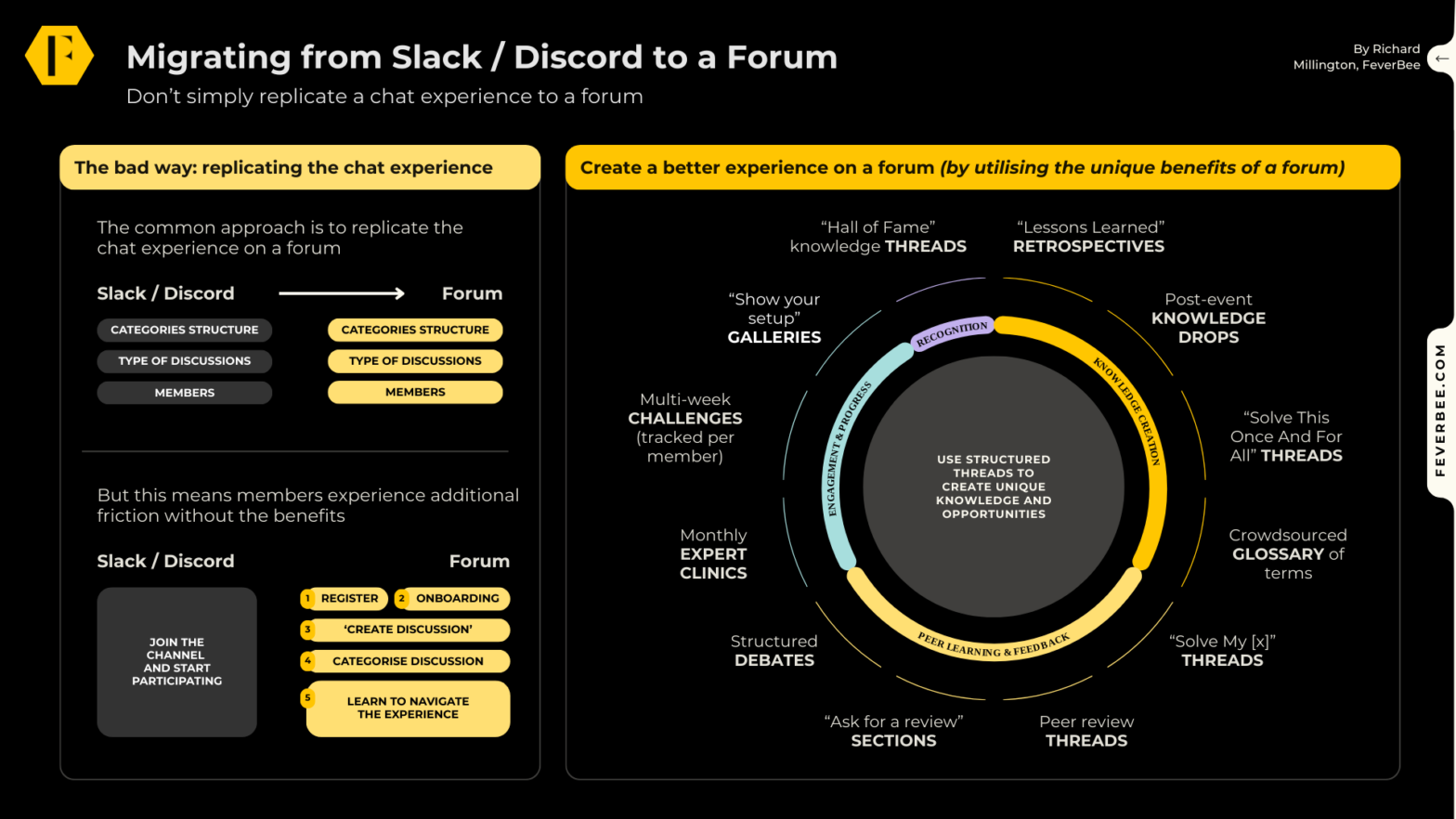 Switching from a chat platform like Slack or Discord to a forum isn’t as simple as shifting to a new messaging app. Forums slow the pace and change how people participate. Don’t treat your forum like a chat room—recognize it’s a new, more deliberate way to build community.