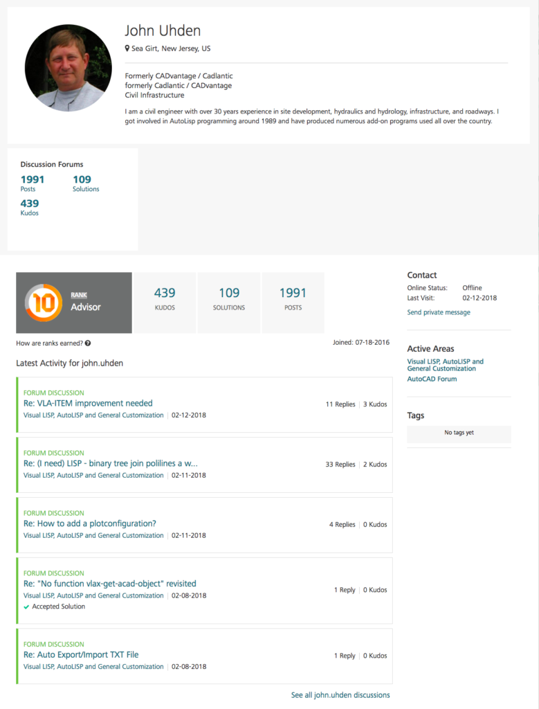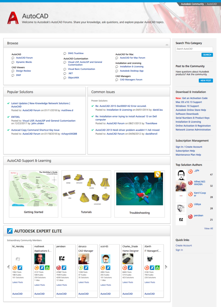 - At the bottom is the Autodesk Expert Elite members. This is a simple and effective way to highlight best members. Some communities put this group at the top, this is a mistake, being featured on a website has as minimal impact upon participation.
