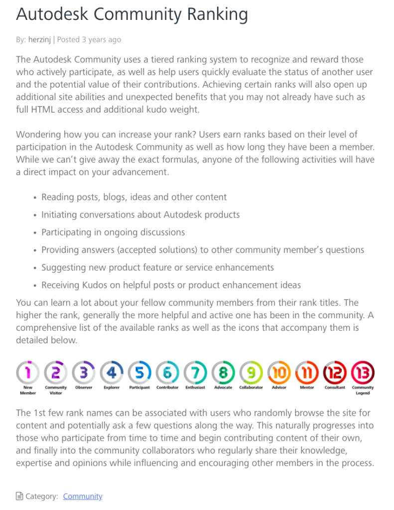 This explanation invites more questions than it answers. There are 13 unique levels, but there are no obvious benefits or unique badges for achieving each level. It’s not even clear how to reach each new level. This is a huge missed opportunity for a community as successful as Autodesk. Autodesk also doesn’t appear to be using any unique badge system. The Apple community has a far superior system.