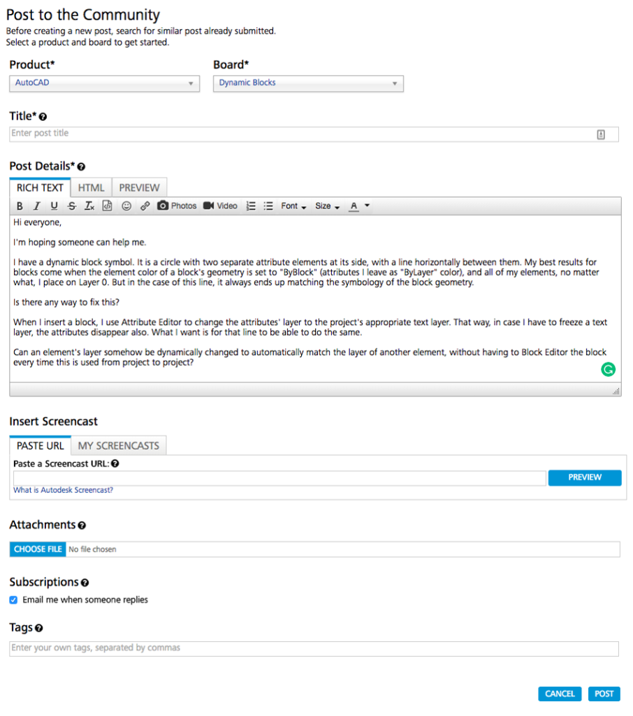 - Asking a question is well executed here. The product and board are automatically selected. There is a very quick line of advice to ensure people ask a good question (this could benefit to a link/drop-down). The introduction of a screencast is a terrific touch. Encouraging members to add screenshots and videos is a really great idea. The only possible improvement is automatically suggesting some relevant tags (similar to Apple’s community).