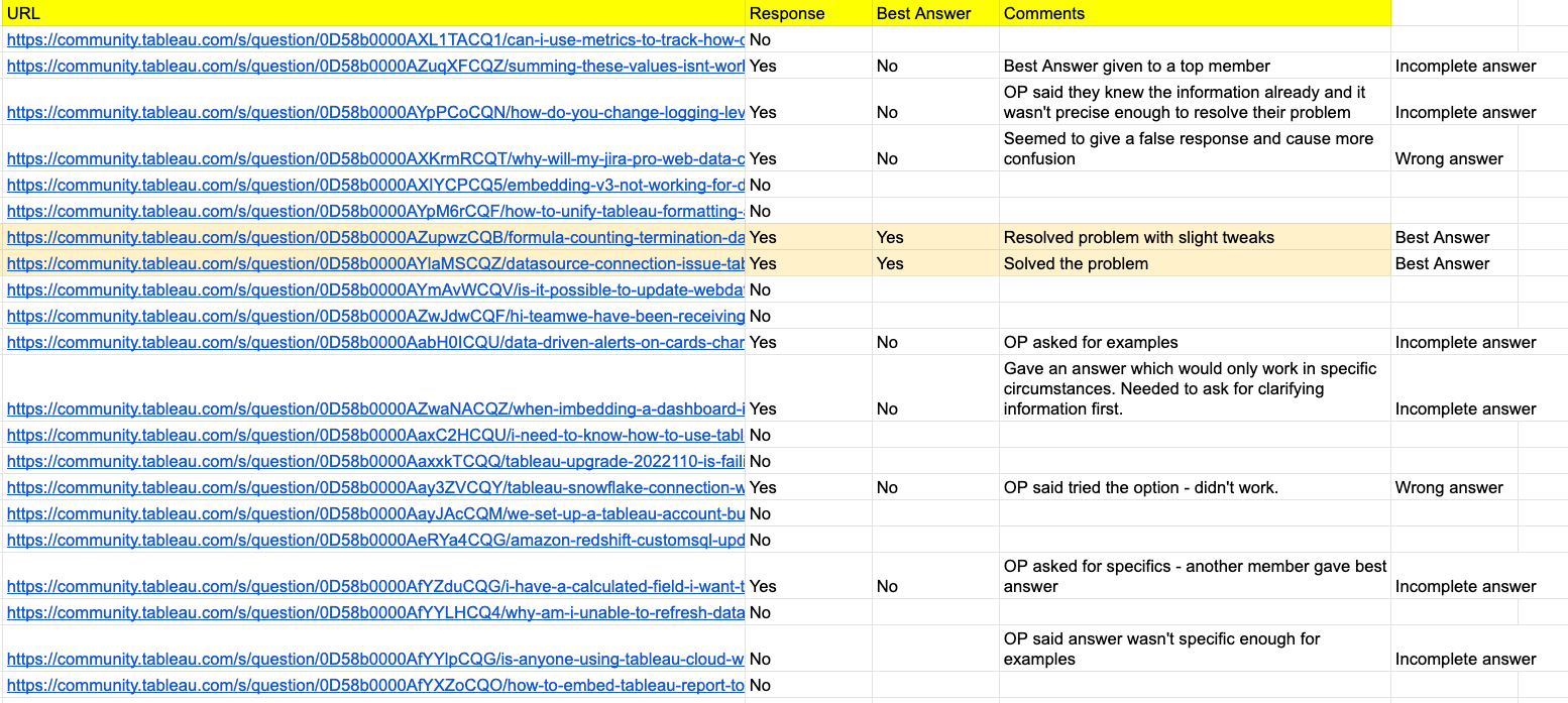 For this test, we found 20 unanswered questions in the Tableau community over several weeks.