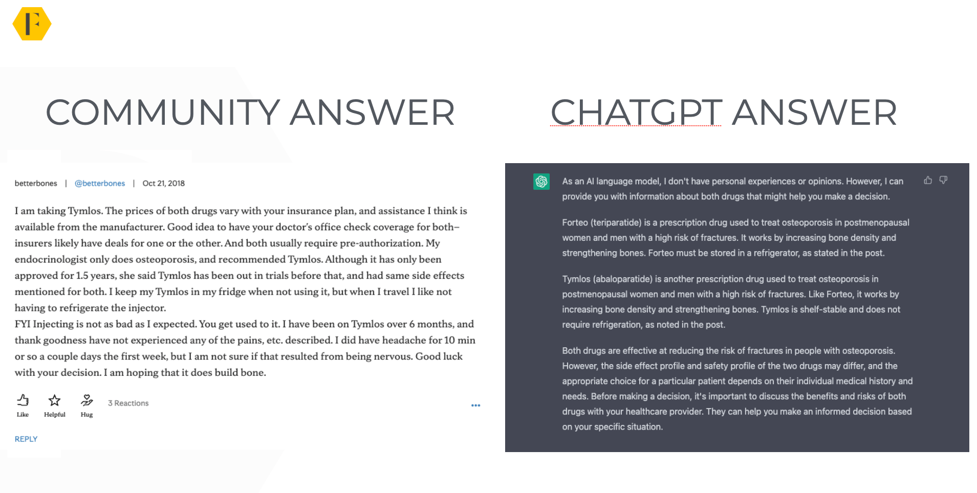 The community answer is the clear-cut winner. Not only that but there are 48 pages(!) of responses to review the aggregated experiences of many, many, people. As noted in the ChatGPT answer, it’s only capable of giving a generic answer about the drugs. It can’t share the experiences of either of them.