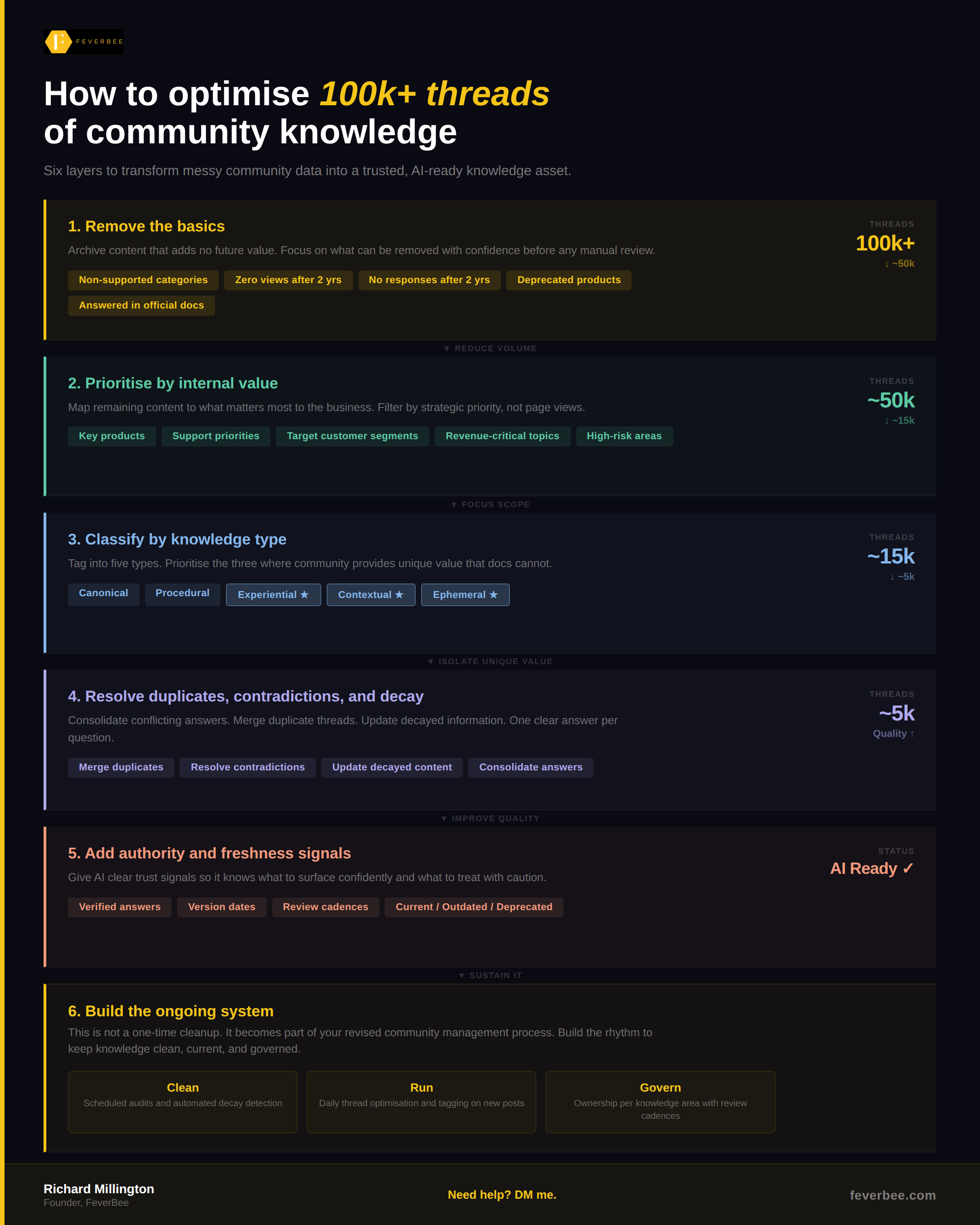 Layer 6: Build the ongoing system. This isn’t a one-time cleanup. It becomes part of your revised community management process. That means scheduled audits and automated decay detection (Clean), daily thread optimisation and tagging on new posts (Run), and ownership per knowledge area with review cadences (Govern).